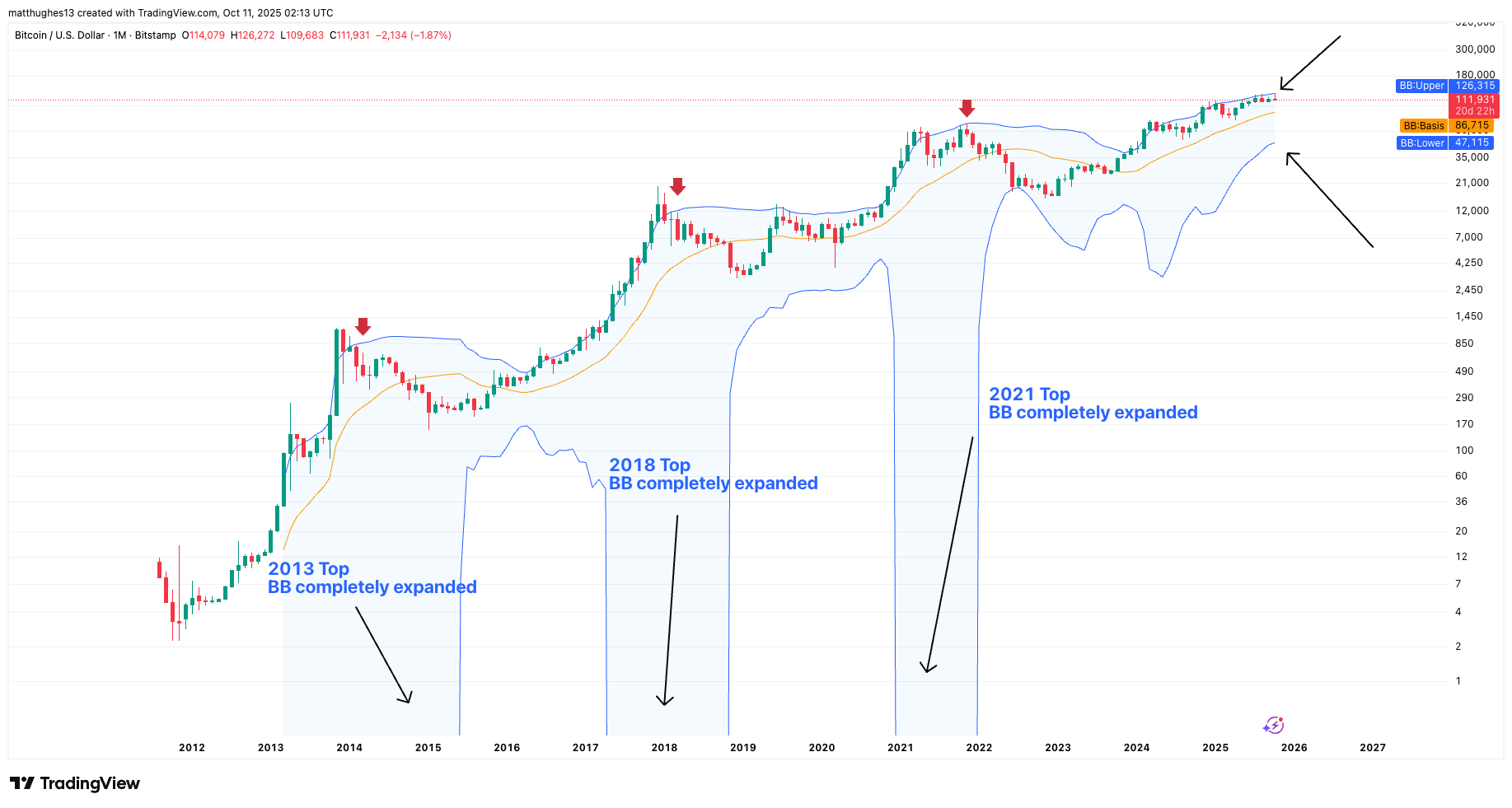 In previous bull cycles, including 2013, 2018, and 2021, Bitcoin peaked precisely when those monthly bands stretched far apart, signaling overheated volatility.