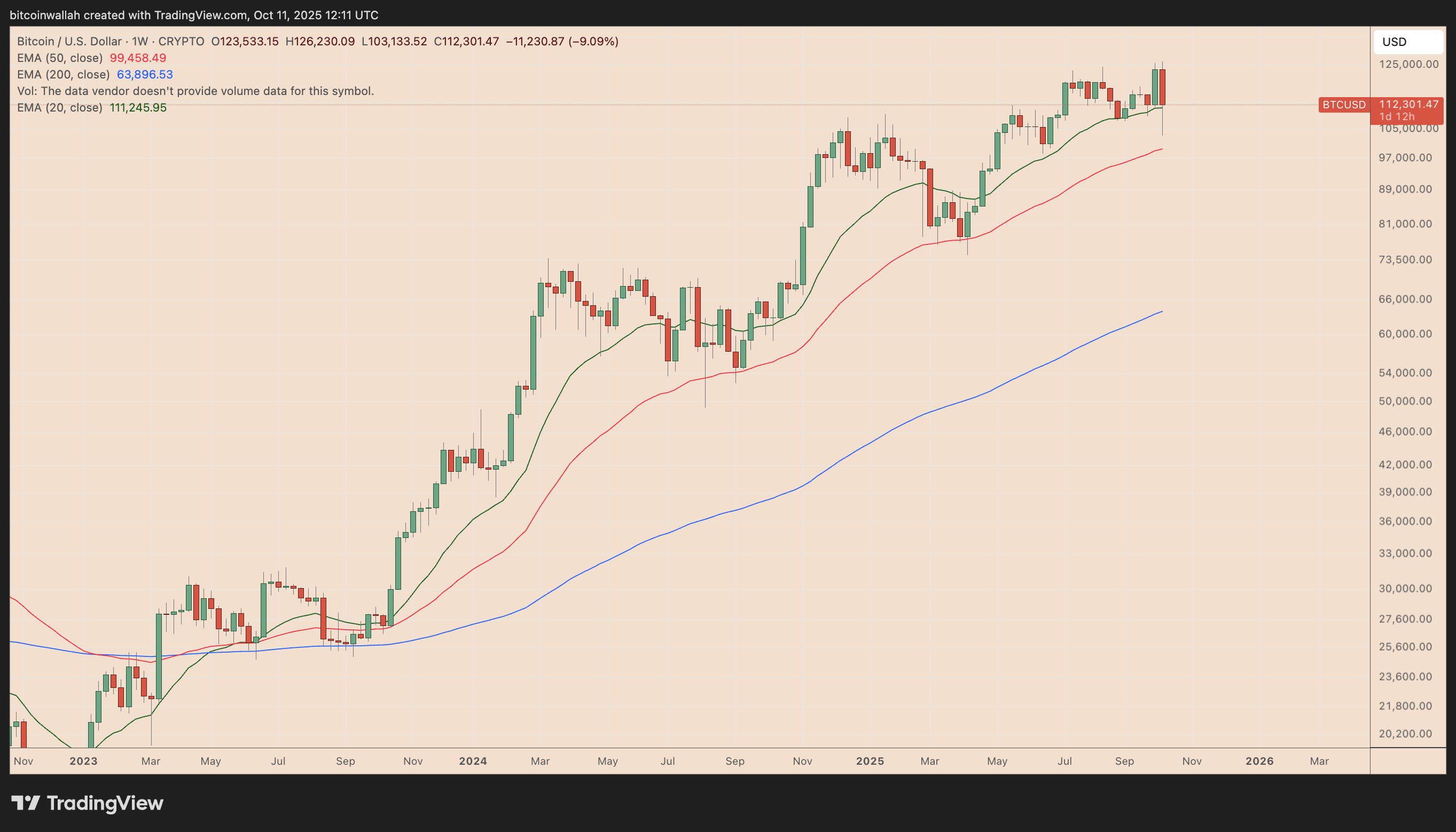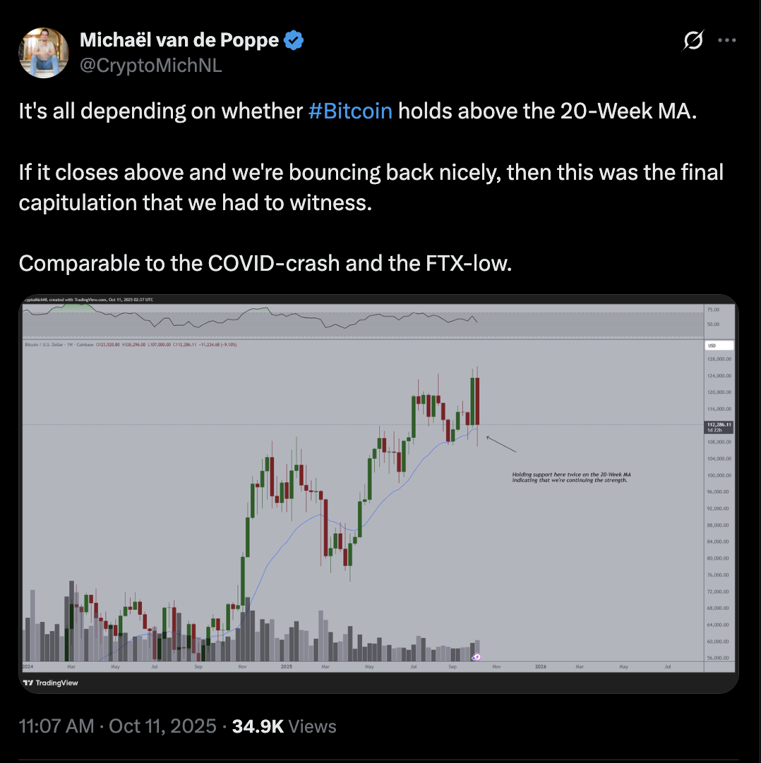 The key level to watch now is the 20-week moving average (20-week MA) near $111,000, according to analyst Michaël van de Poppe.