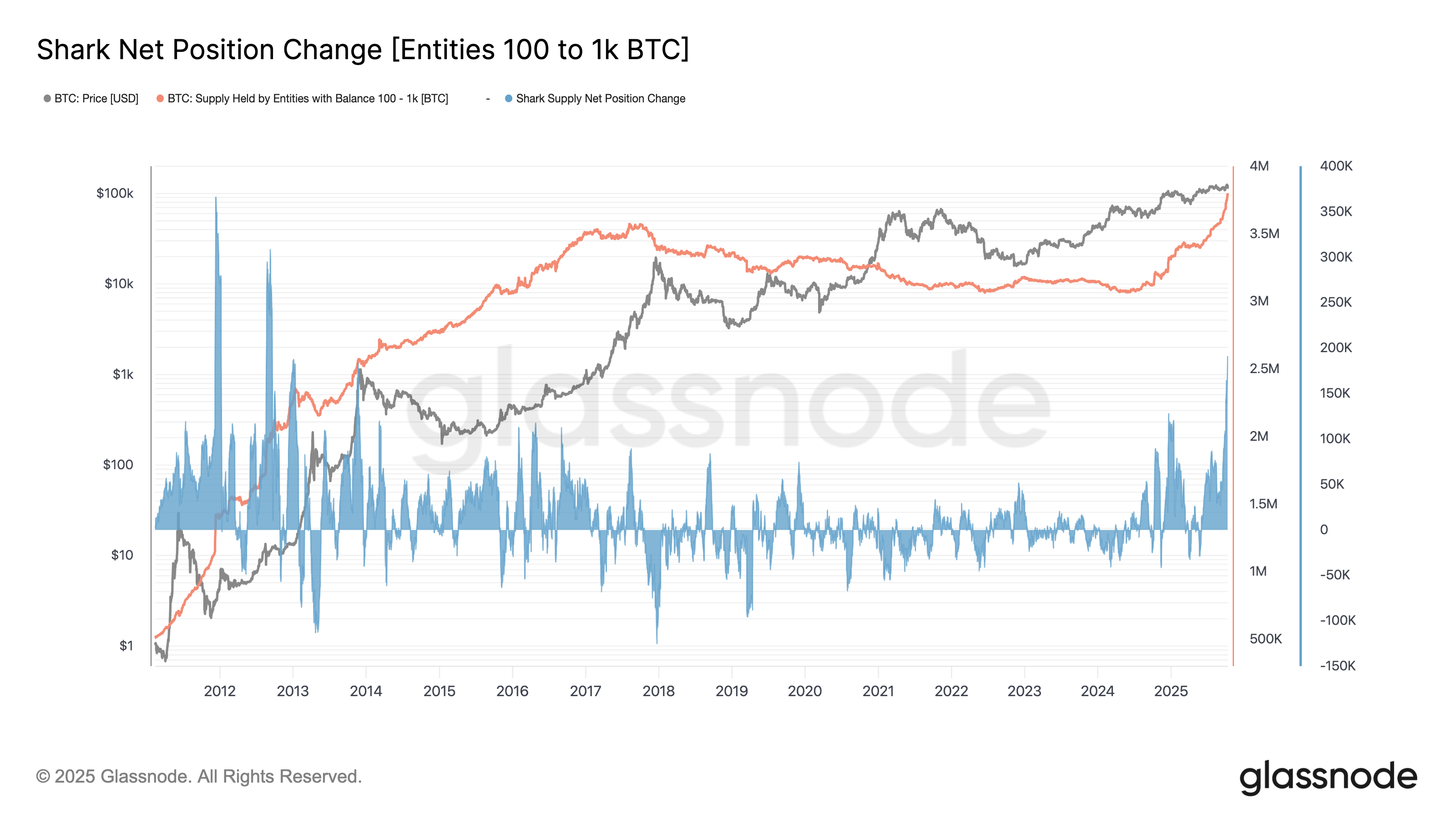 The daily Shark Net Position Change, which tracks wallets holding between 100 and 1,000 BTC, has surged to 190,296, its highest level since September 2012, according to Glassnode data.