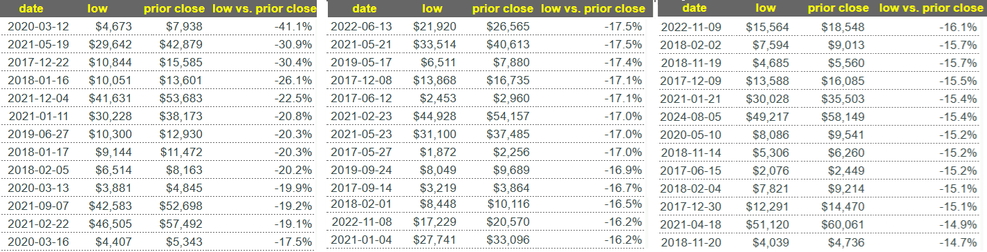 Even excluding the “COVID crash” — an impressive 41.1% intraday plunge on March 12, 2020 — which may have been amplified after the leading Bitcoin derivatives exchange at the time, BitMEX, faced liquidation issues and a brief 15-minute outage, there are still 48 other days when Bitcoin endured even deeper corrections.