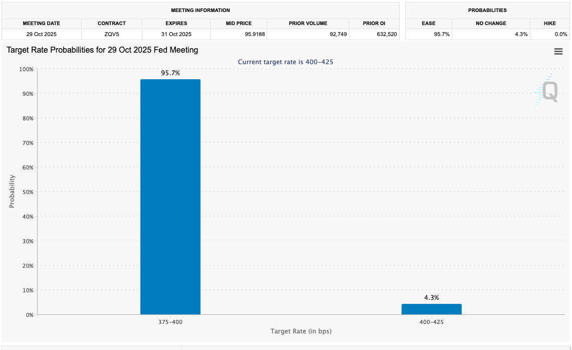 Expectations remain almost unanimous that the Fed will cut rates by 0.25% at its Oct. 29 meeting, per data from CME Group’s FedWatch Tool.