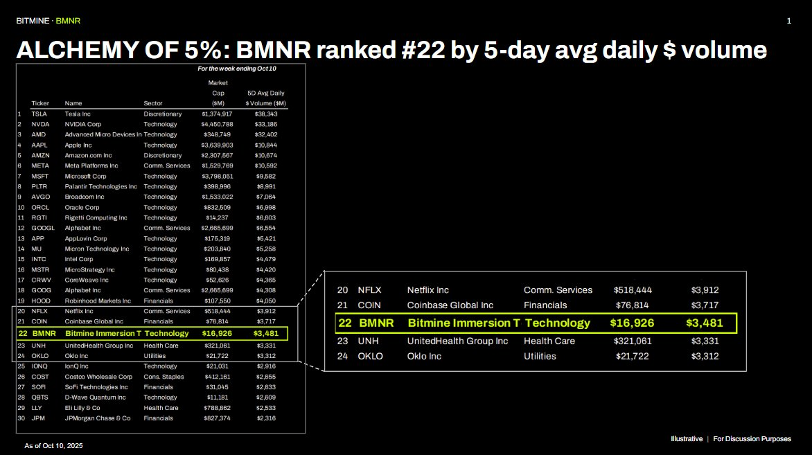 BMNR was the 22nd most widely traded stock on US markets, based on its average five-day trading volume of over $3.5 billion, as of Oct. 10.