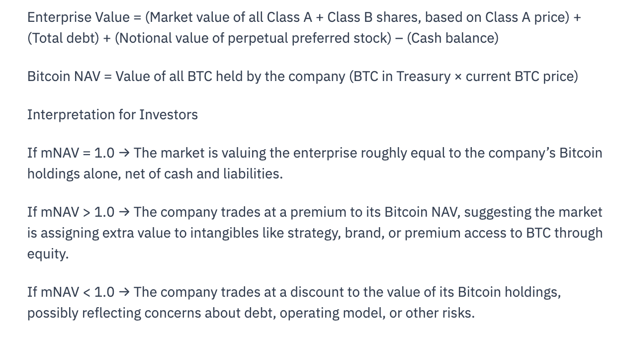 Unlike traditional net asset value (NAV), mNAV is a ratio of enterprise value to Bitcoin NAV, designed to help investors gauge how the market values the company relative to its underlying BTC holdings, according to a mNAV page on BitcoinTreasuries.NET.