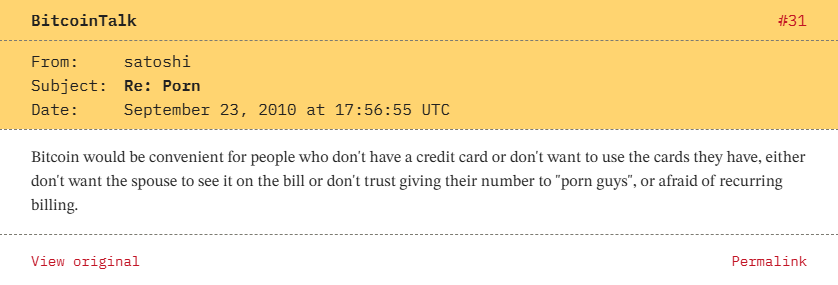 Satoshi Nakamoto once described Bitcoin’s utility for porn payments. (Satoshi Nakamoto Institute)