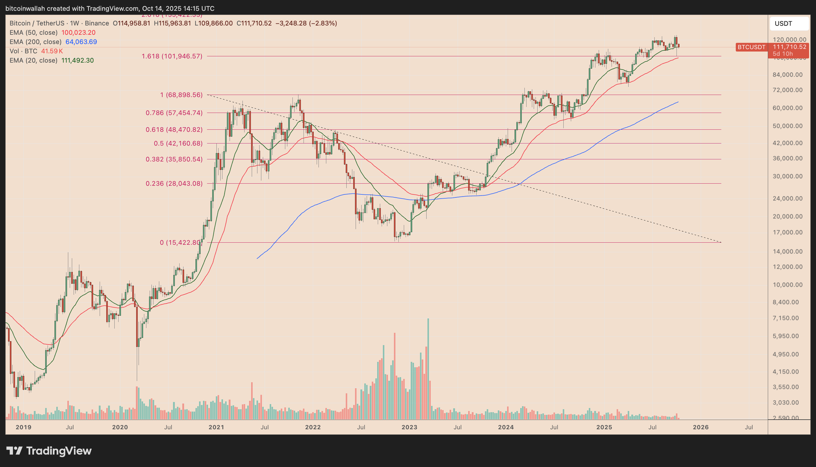 This region also aligns with Bitcoin’s 50-week exponential moving average (50-week EMA, represented by the red wave) and the 1.618 Fibonacci retracement line, lending technical weight to it as a potential target zone.