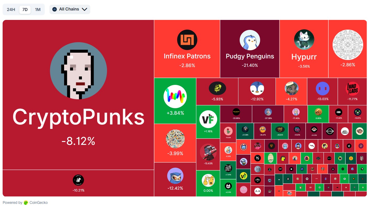 CryptoPunks, the number one NFT collection by market capitalization, is down by 8% on the weekly charts and nearly 5% on the 30-day NFT performance chart.