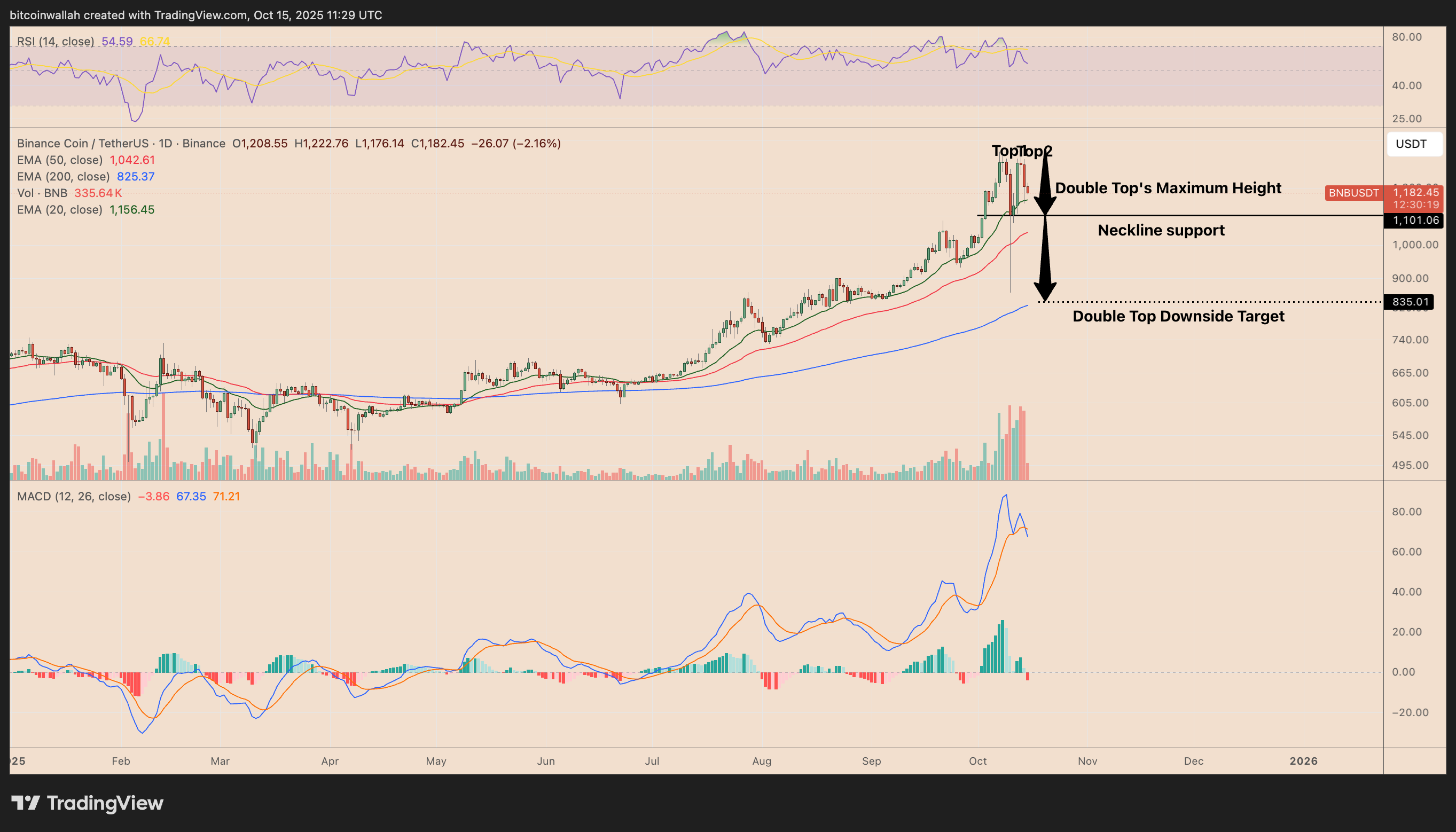 BNB’s daily chart reveals a classic double top formation near the $1,350-$1,375 area, signaling potential trend exhaustion after a 95% year-to-date rally.