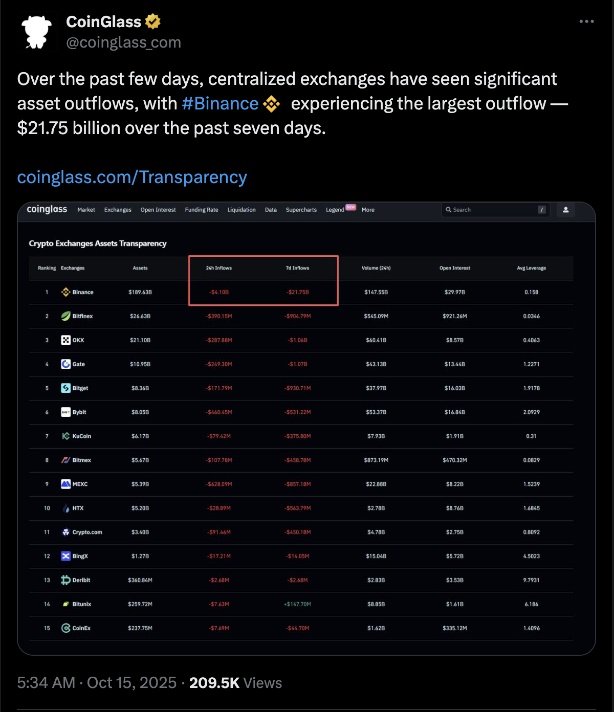 Binance witnessed the highest $21.75 billion in user withdrawals from a centralized exchange over the past week, including $4.1 billion in outflows within a day, according to data resource CoinGlass.