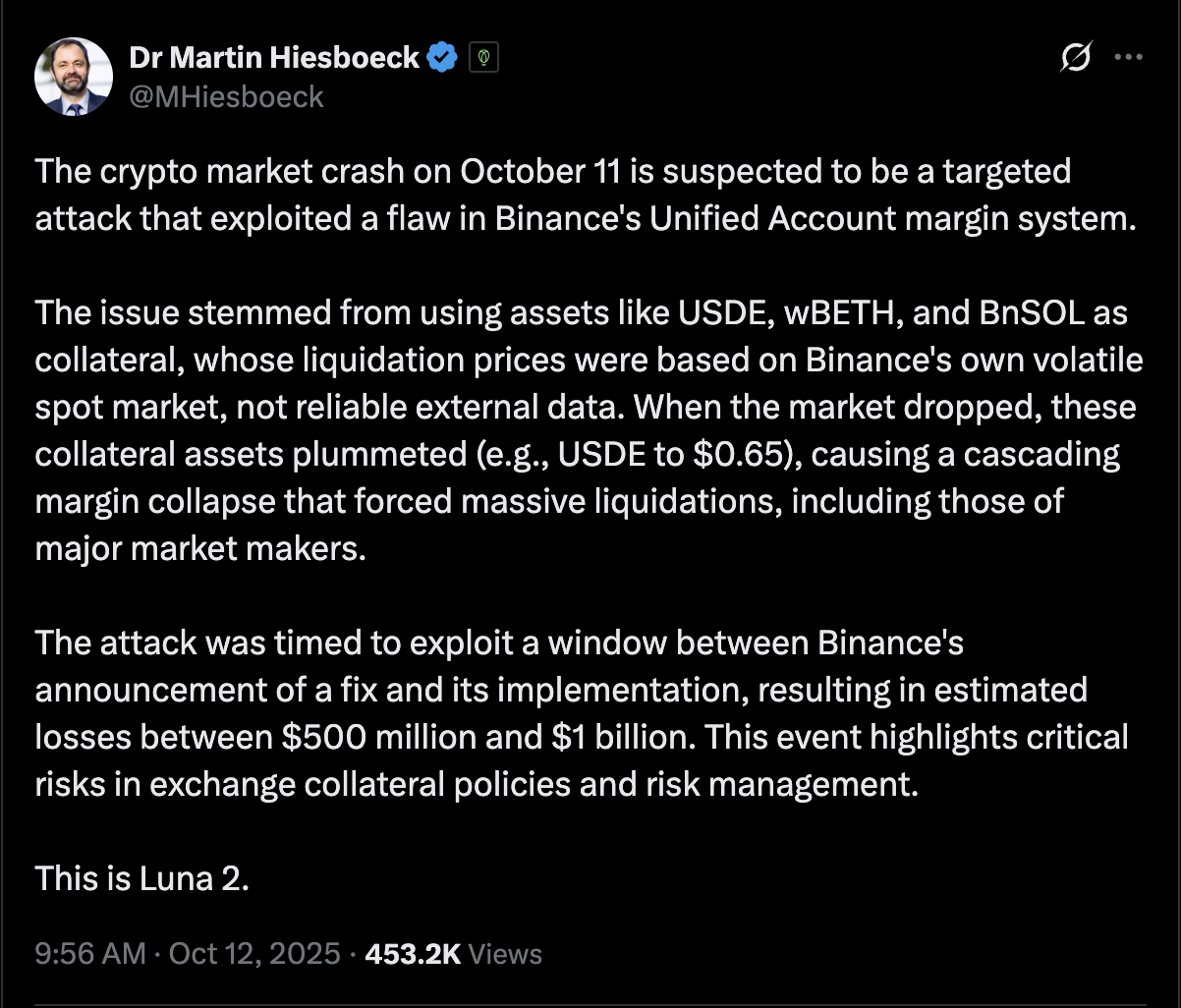 Some analysts now suspect that the $20 billion liquidation event crash was a targeted exploit on Binance’s Unified Account margin system.