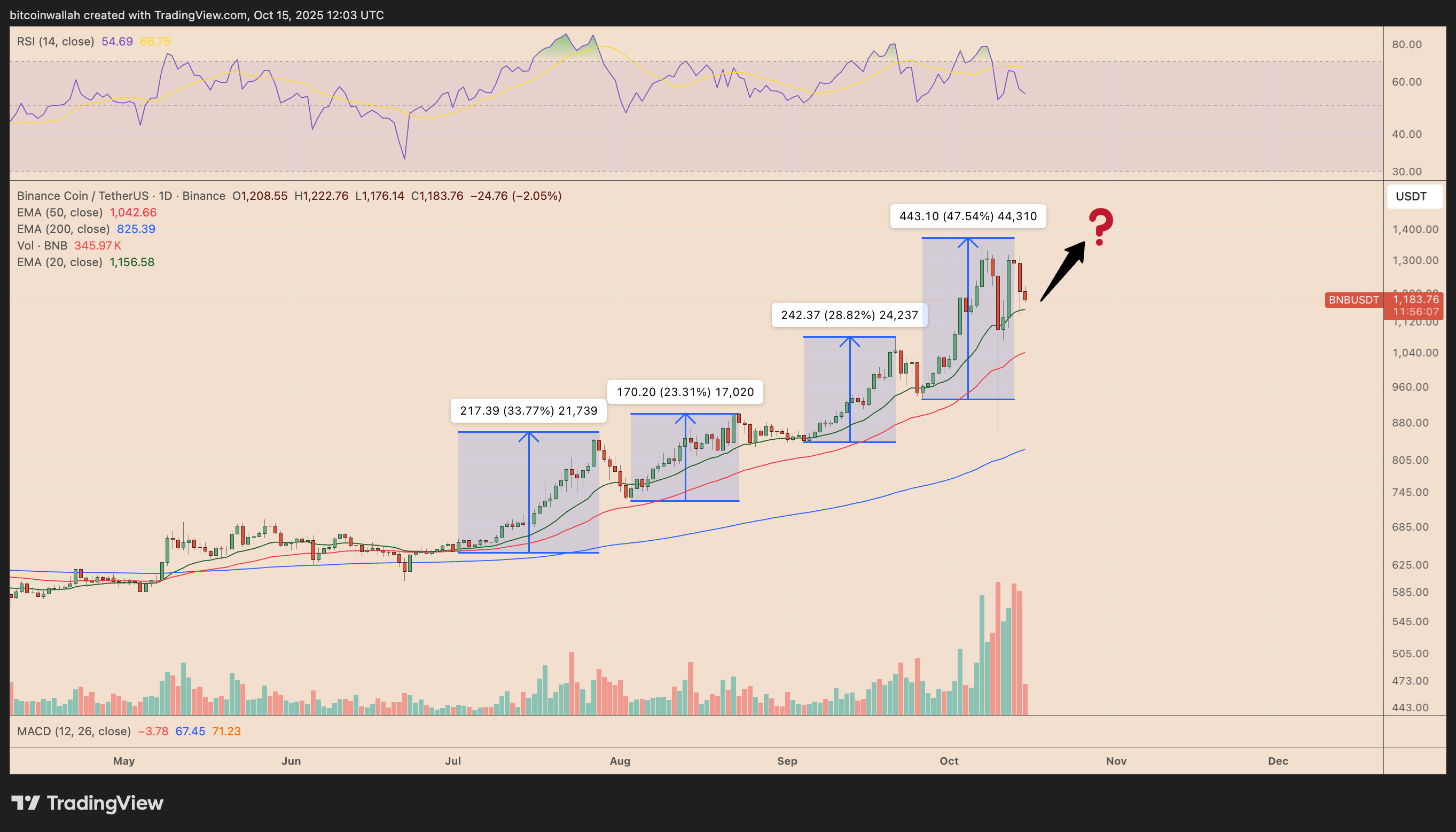 BNB still trades above its key exponential moving average (EMA) supports, including the 20-day EMA (the green wave) near $1,155 and the 50-day EMA (the red wave) at around 1,042.