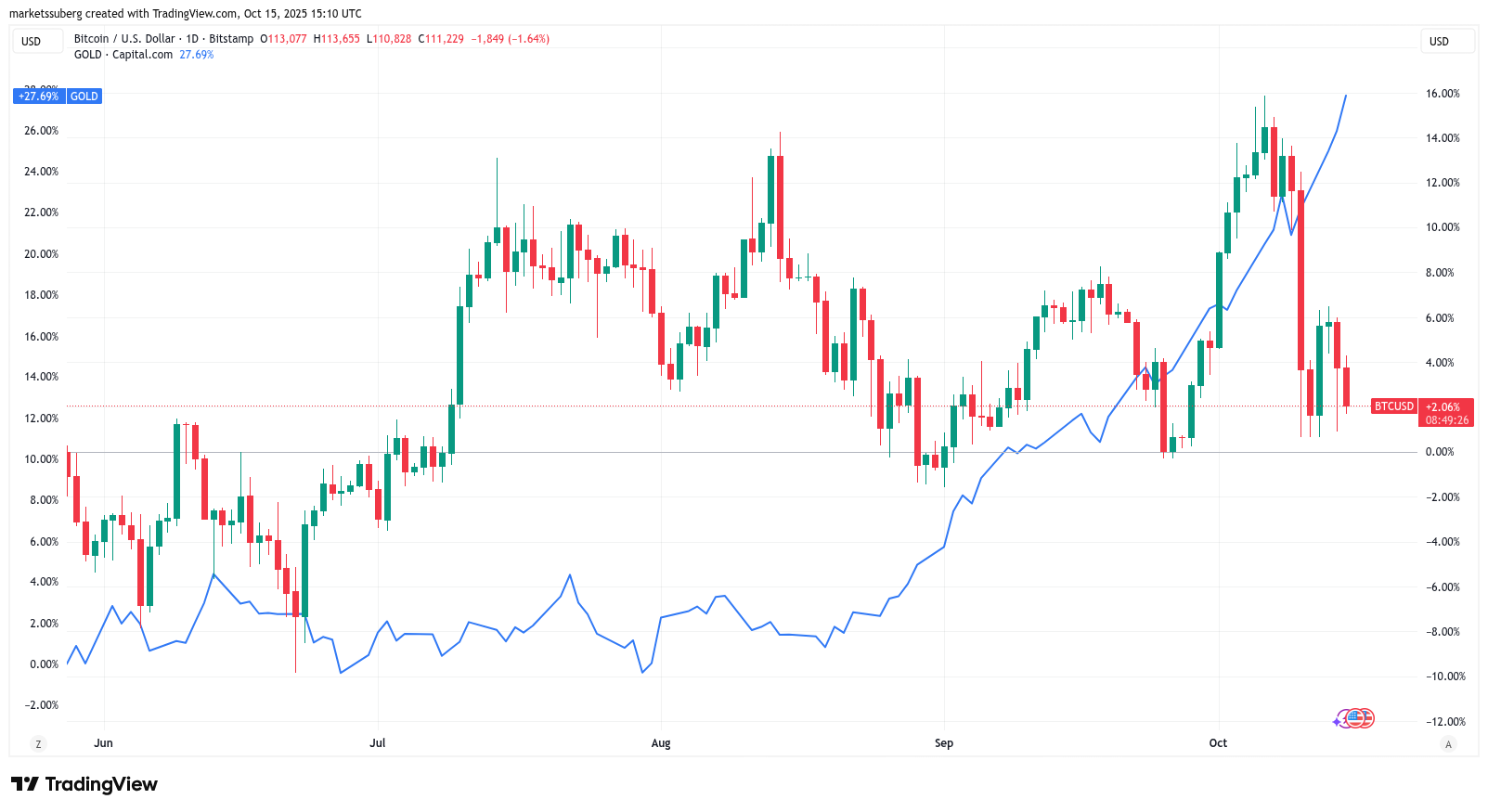 While Gold Hits All-Time Highs, Bitcoin Slips Under $111,000
