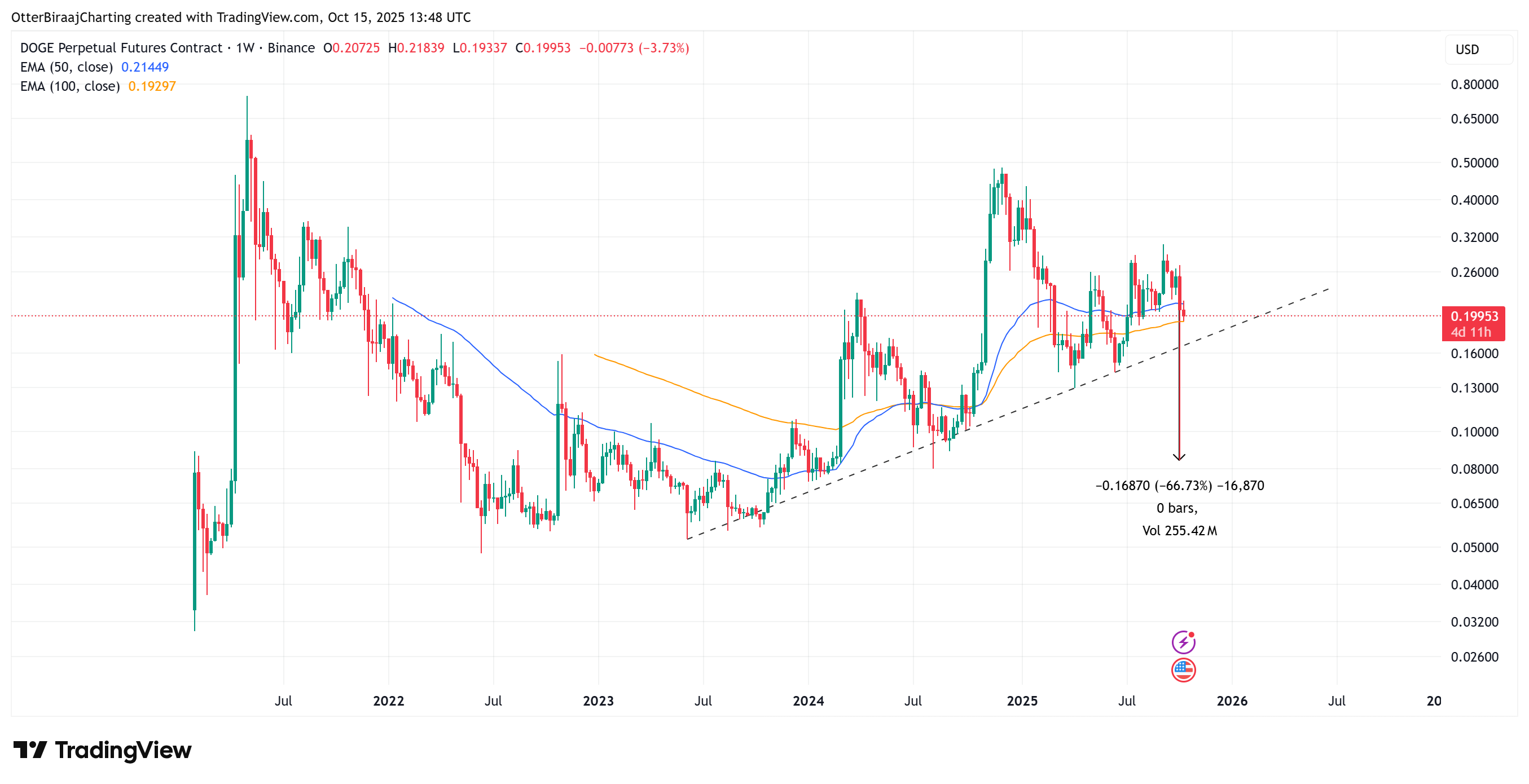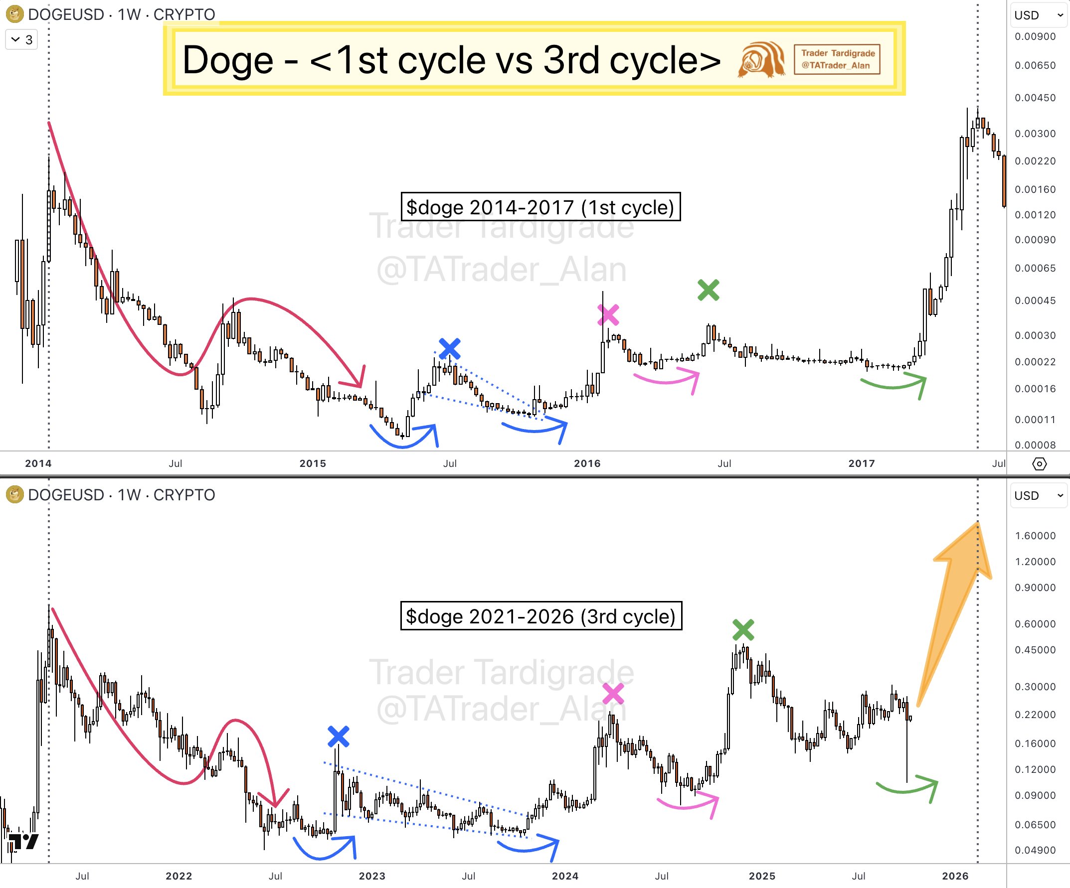 Similarly, market analyst Trader Tardigrade highlighted that DOGE’s current structure mirrors its 2014–2017 bull cycle, implying that a breakout rally could follow, potentially targeting $1.60 by early 2026.