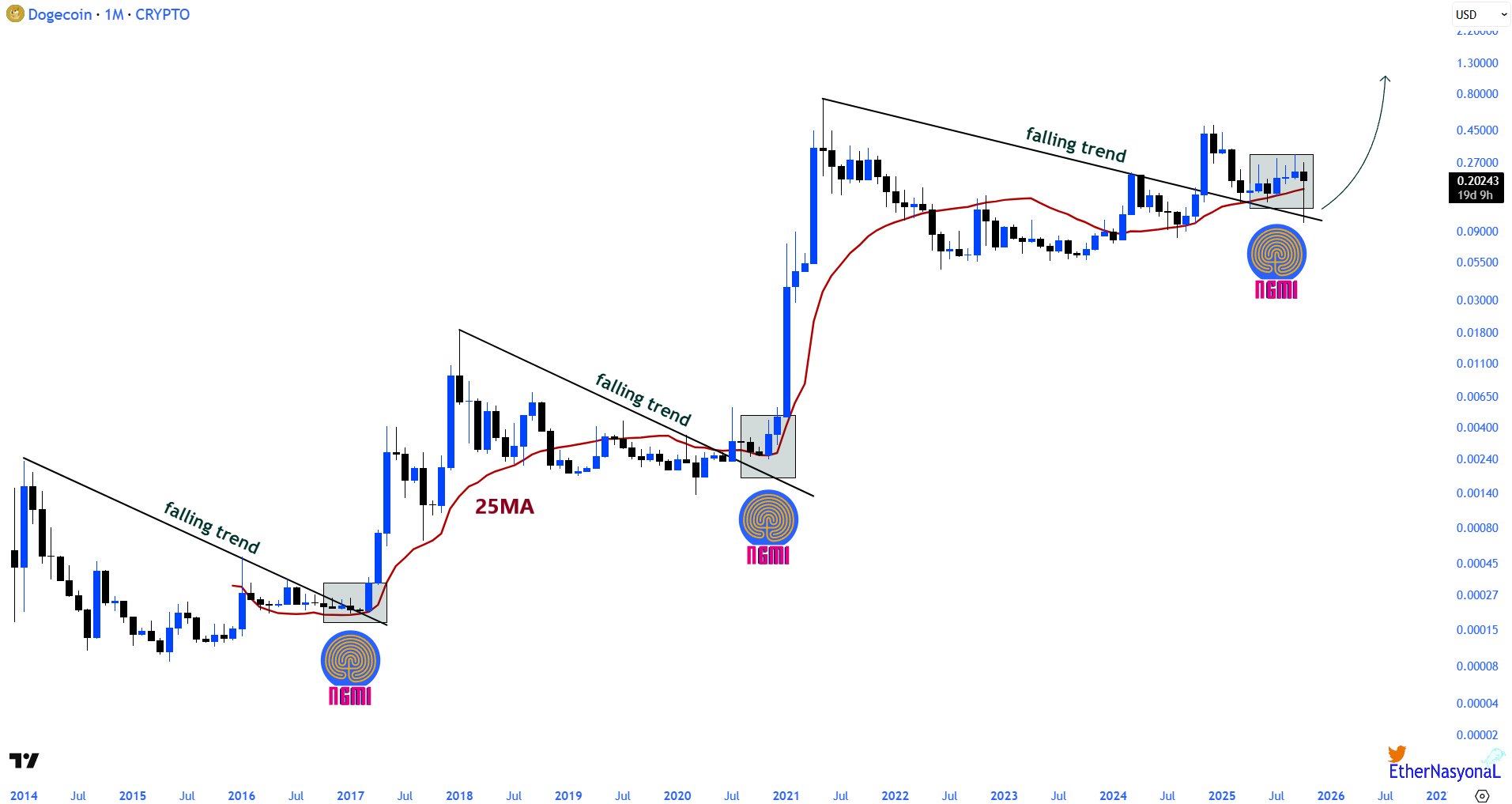 Crypto trader EtherNasyonal observed that every significant DOGE rally in history began after maintaining persistence above the 25-day moving average, breaking a long-term falling trend, and entering a retest phase. The trader said that all these conditions are currently in place, pointing out that DOGE tends to begin its major runs under conditions of disbelief and market fatigue.
