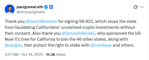 On Oct. 14, Paul Grewal, chief legal officer of Coinbase, hailed the new law as a step in the right direction in protecting crypto investor rights.