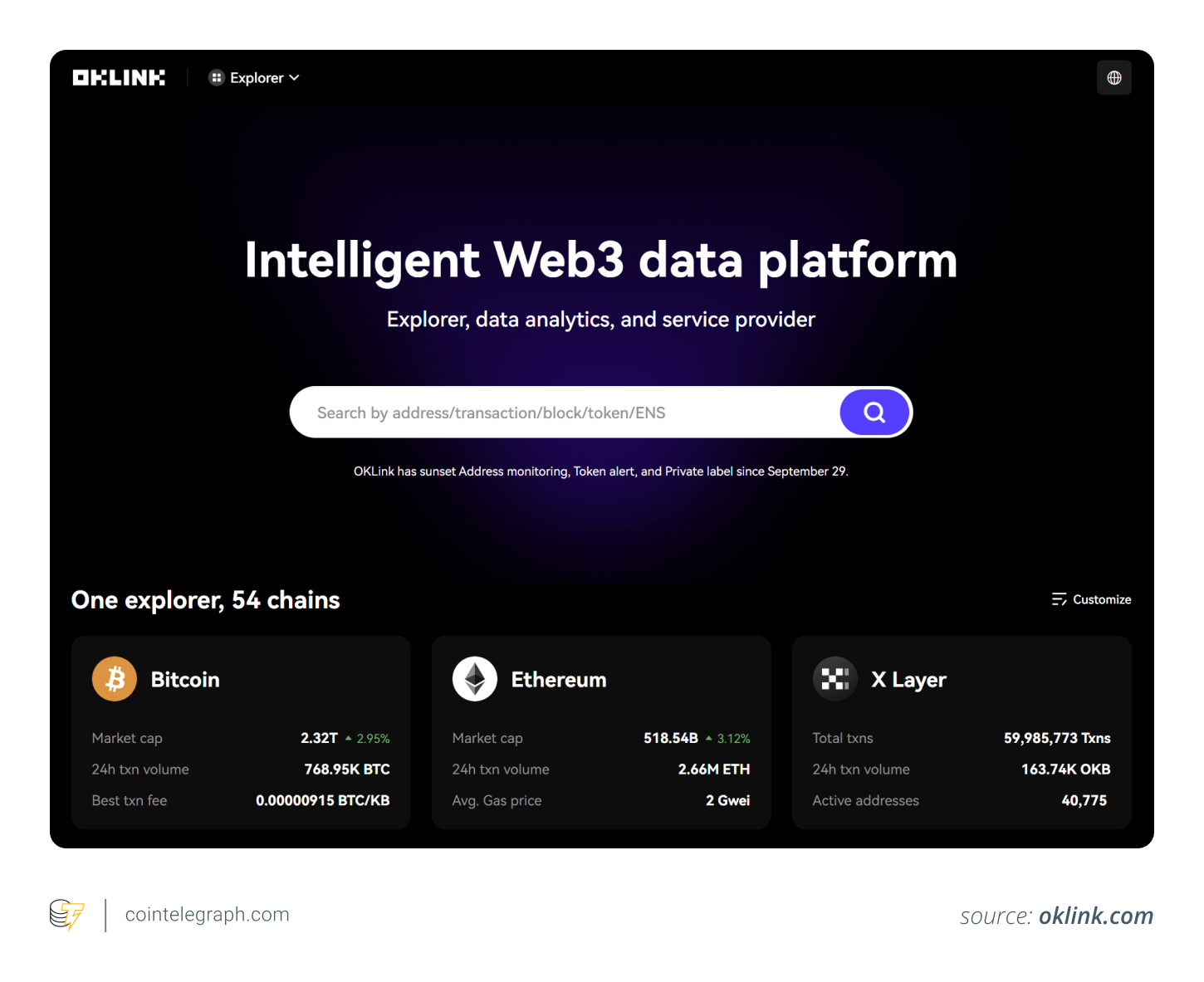 OKLink is a professional-grade, multichain blockchain explorer developed under the OKG Technology Group. It supports major blockchains such as Ethereum and Bitcoin, offering robust tools for transaction tracking, stablecoin monitoring and onchain risk analysis. Known for its strong compliance and Anti-Money Laundering (AML) features, OKLink is widely used by analysts, compliance teams and institutions that require deeper blockchain visibility beyond basic transaction searches.