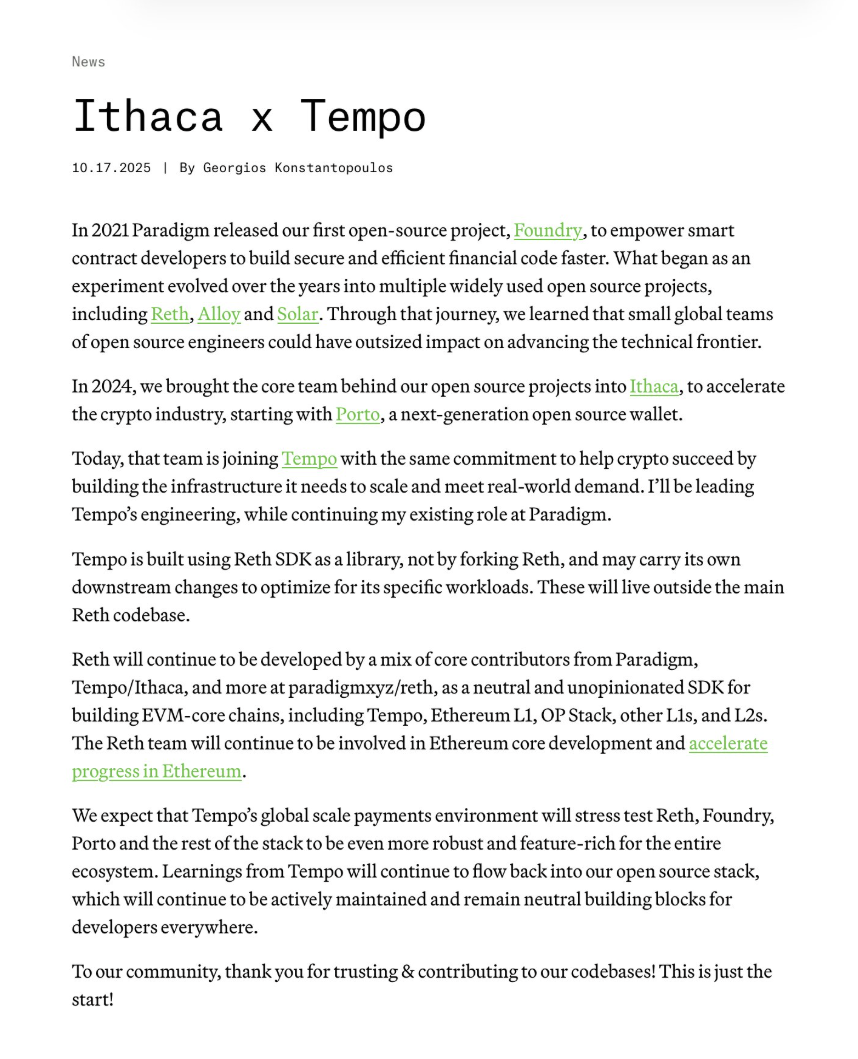 Though no launch date has been given for Tempo, Paradigm Chief Technology Officer Georgios Konstantopoulos said on Friday that the core team behind its open-source projects at Ithaca is joining Tempo to help build the blockchain’s payments infrastructure and scale its engineering efforts.