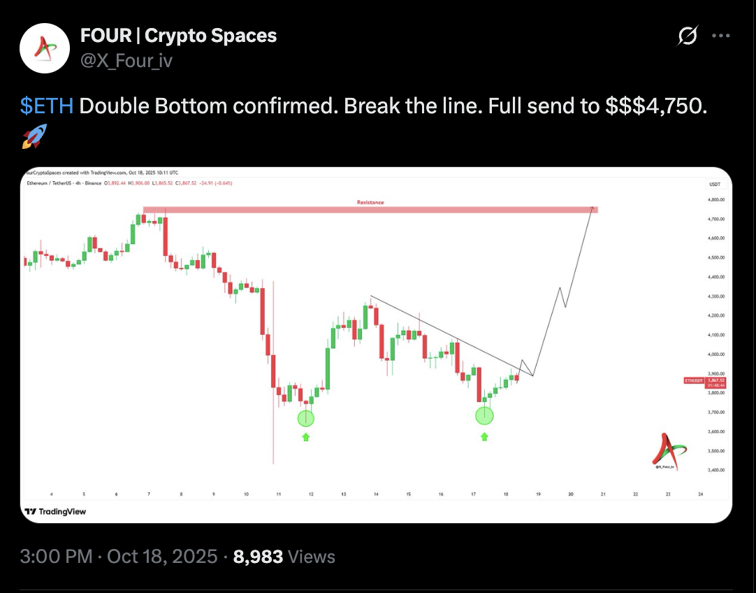 The interim upside target aligns with analyst FOUR’s double bottom technical setup, which shows ETH’s price to hit the structure’s neckline resistance at $4,750 in the coming days.
