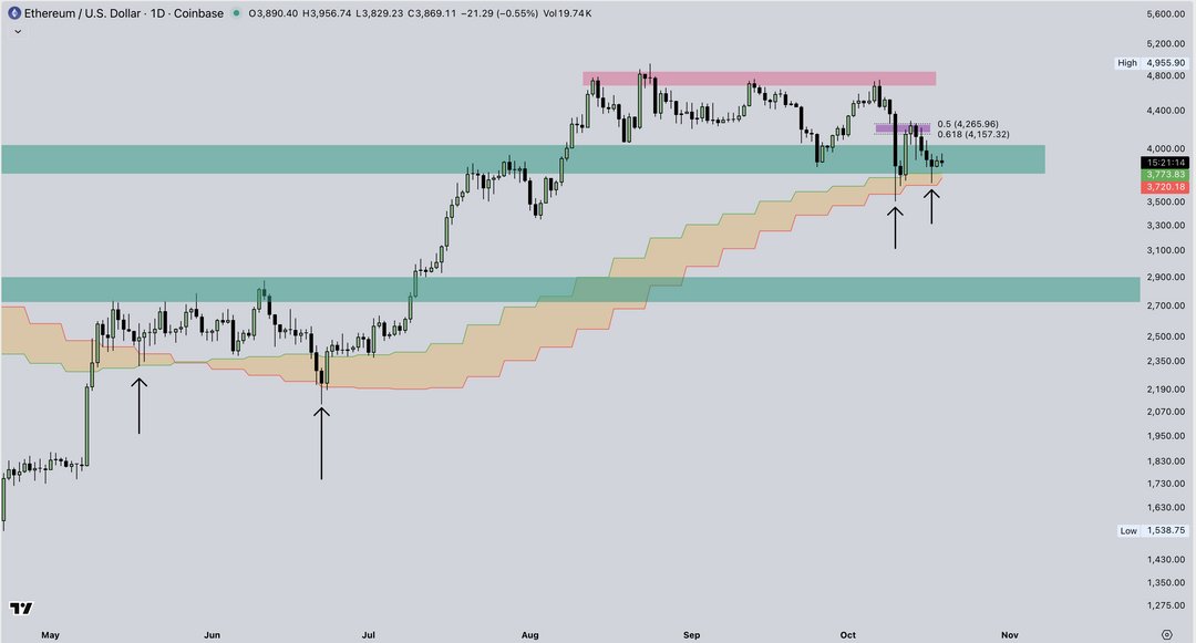 Each time ETH has bounced off this midpoint, including in early 2021, mid-2023, and early 2024, it has advanced toward the +1σ (standard deviation) band, currently hovering near $5,000.