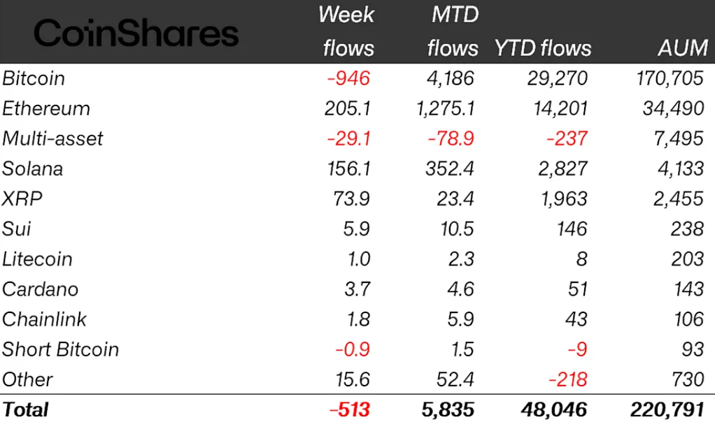 Crypto exchange-traded products (ETPs) saw $513 million in outflows last week, ending the two-week streak totaling $9.1 billion, CoinShares reported on Monday.