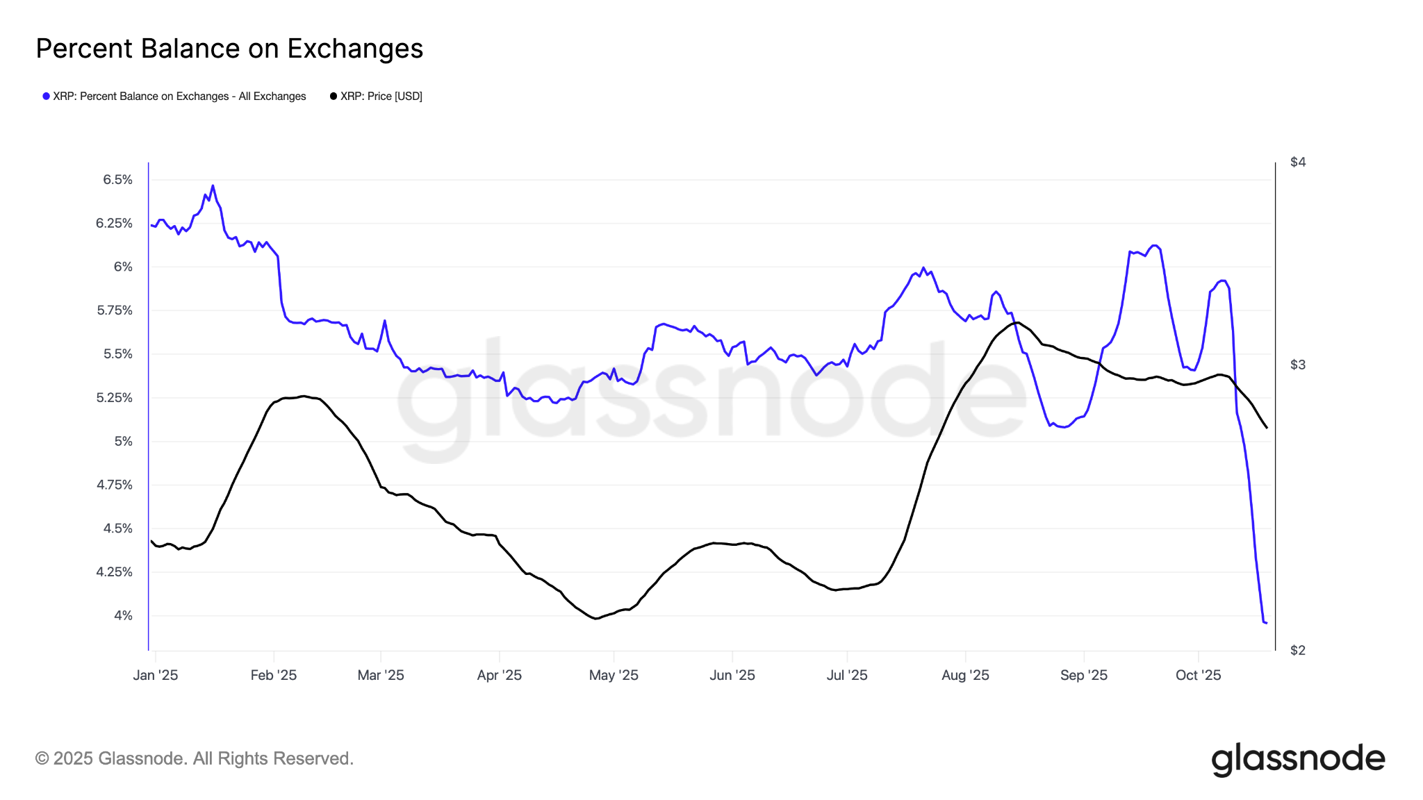 The chart below shows that the percentage of XRP supply on exchanges dropped to 3.9% from 6.12% between Sept. 19 and Oct. 19.