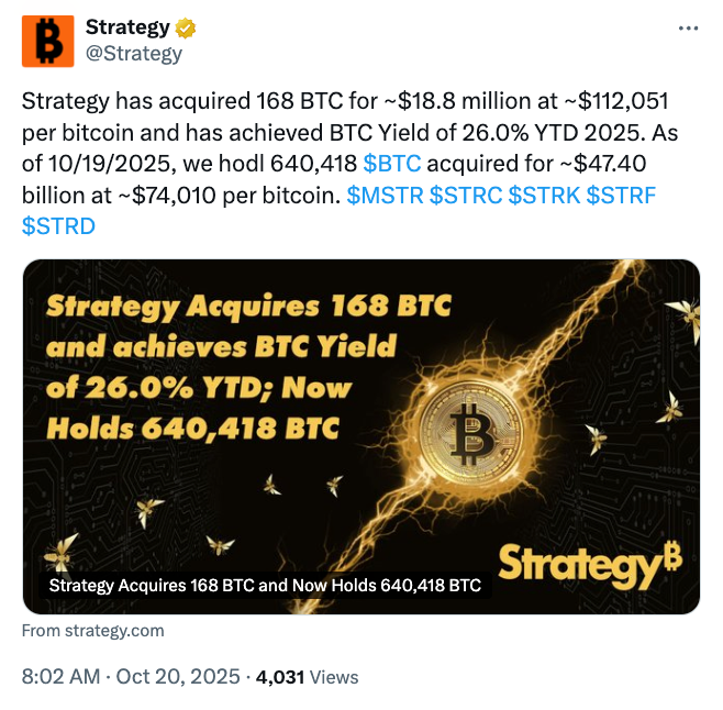 The latest Bitcoin purchase followed a 220 BTC buy for $27.2 million the previous week, which came as BTC briefly hit a new all-time high above $126,000 before plunging to $110,000 in the Oct. 10 market crash.