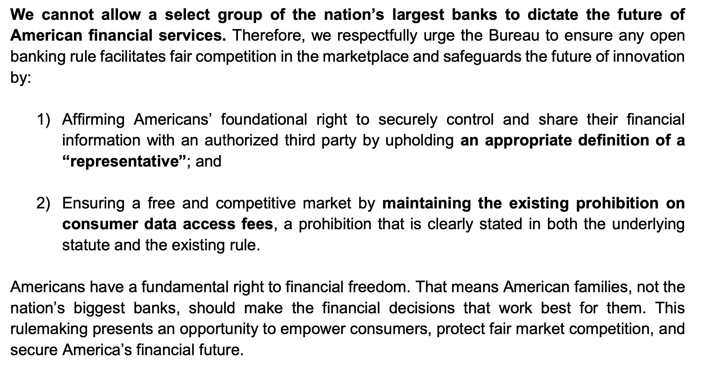 “Yet these rights are under attack,” the letter says. “The nation’s largest banks want to roll back open banking, weaken consumer financial data sharing, and crush competition to protect their position in the marketplace.