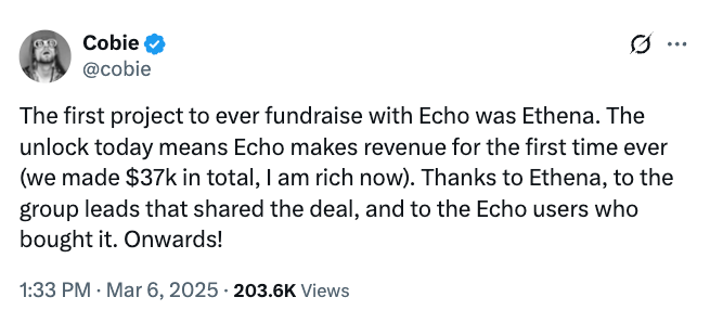 According to Cobie, Ethena was the first project ever to fundraise using Echo, highlighting the platform’s sharp focus on early-stage investing.