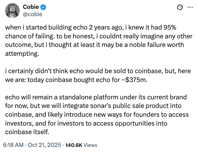 “I certainly didn’t think Echo would be sold to Coinbase, but here we are: Today Coinbase bought Echo for about $375 million,” Cobie wrote on X.