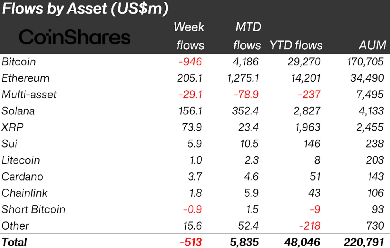 Conversely, global crypto investment products recorded net outflows of $513 million, with investors particularly de-risking from Bitcoin (BTC), the only major asset to see outflows totaling $946 million last week.