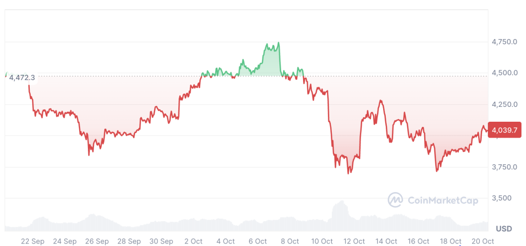 Crypto analyst Titan of Crypto said, a “bullish divergence could be playing out.” This indicator signals that bears are losing power as the price falls to a local low but the oscillator does not. Ethereum’s price is down 11.10% over the past 30 days, trading at $4,039.70 at the time of publication, according to CoinMarketCap.