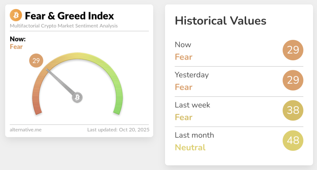 The Crypto Fear & Greed Index, which measures overall crypto market sentiment, has fallen significantly since Trump announced the tariffs on Oct. 10, when it was sitting at a “Greed” score of 70. It is now at a “Fear” score of 29.