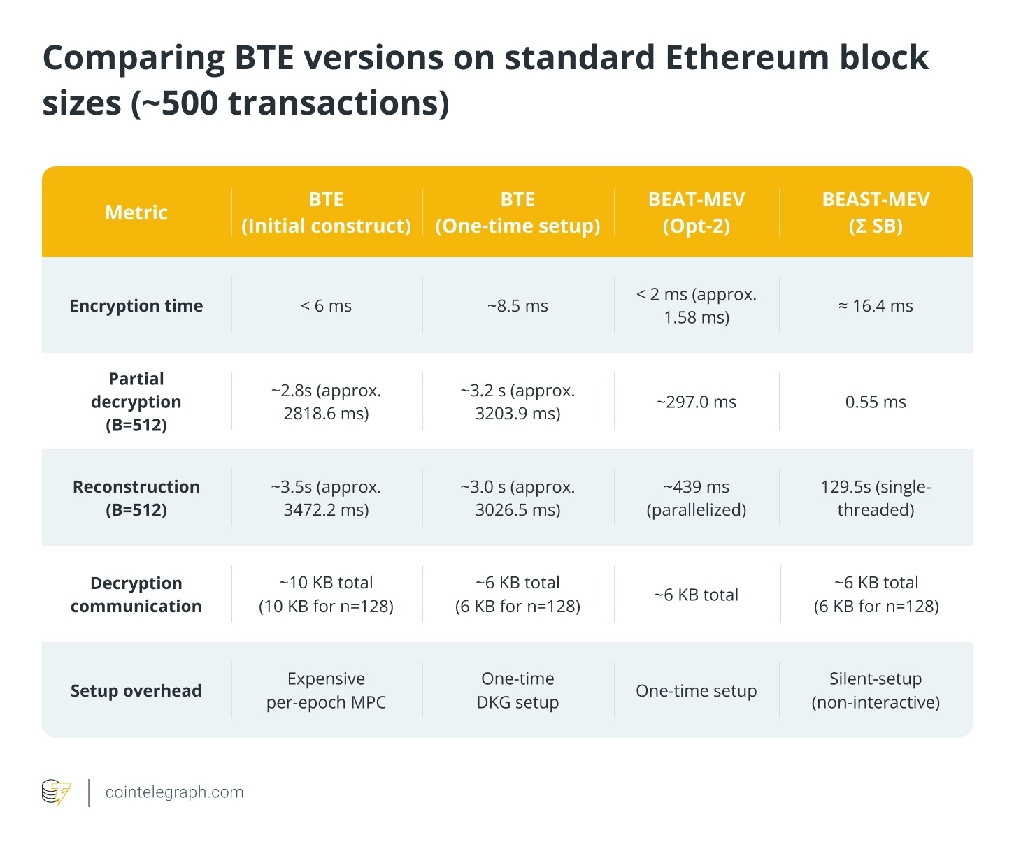However, combining all the partial decryptions afterward still required heavy interactive computation. To fix this, BEAST-MEV borrowed BEAT-MEV’s sub-batching technique and used parallel processing to let the system decrypt large batches (up to 512 transactions) in under one second. The following table summarizes how each successive BTE design improves on the original BTE design.