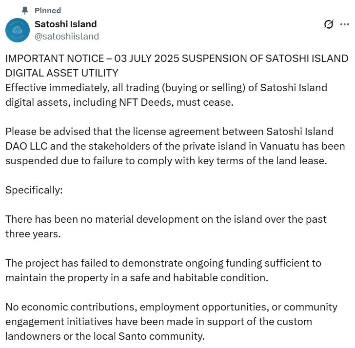 Satoshi Island, a project to acquire an entire island near Vanuatu, launched in 2021 with the aspiration of creating a home for crypto professionals within a blockchain-based economy. Its last update was in July, and the project was still working to establish essential services and secure its license agreement with the island’s stakeholders.