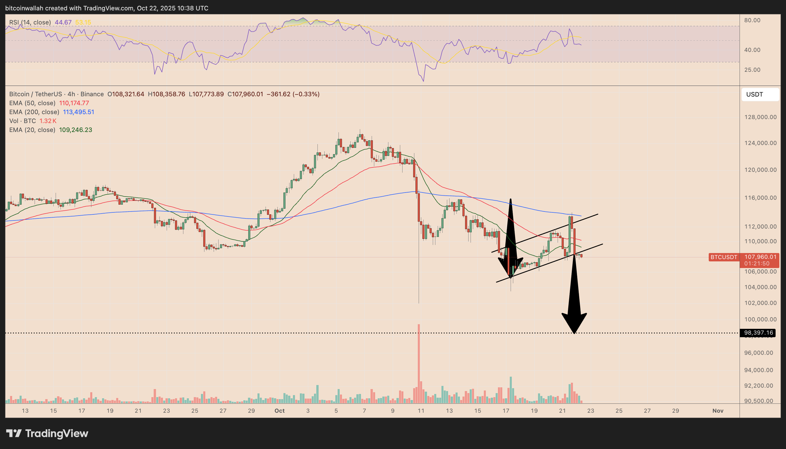 The BTC/USDT 4-hour chart shows Bitcoin slipping under the lower trendline of a bear flag, a continuation pattern that often signals further downside following a brief consolidation.