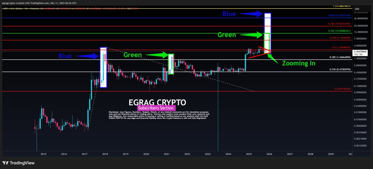 XRP price action reveals a consolidation within a symmetrical triangle on the monthly chart, suggesting that it may be preparing another bullish impulse,  according to analyst Egrag Crypto.