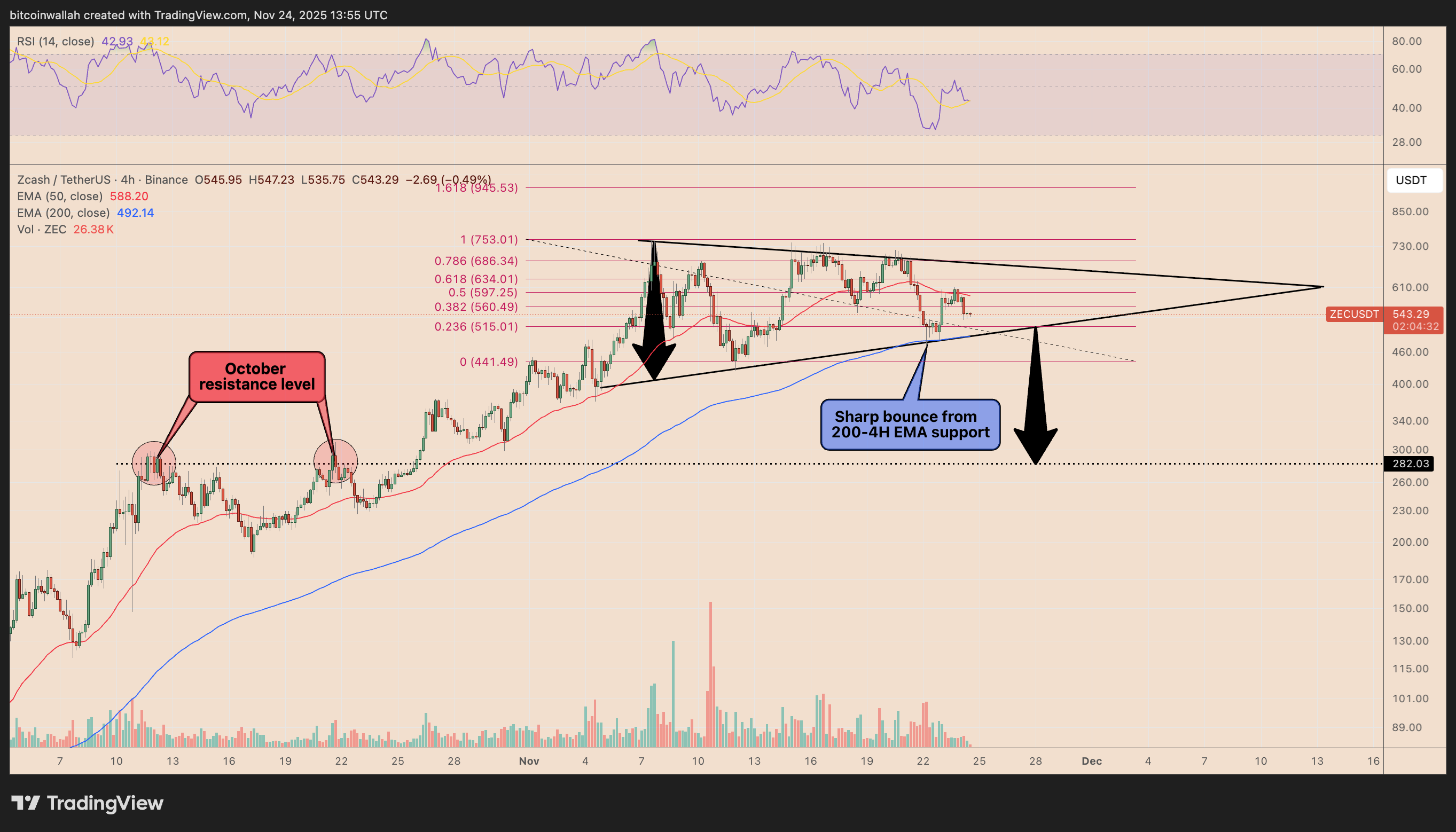 As of Monday, Zcash traded within a symmetrical triangle pattern on the four-hour chart, reflecting indecision among traders following its 1,500% price rally since late September.