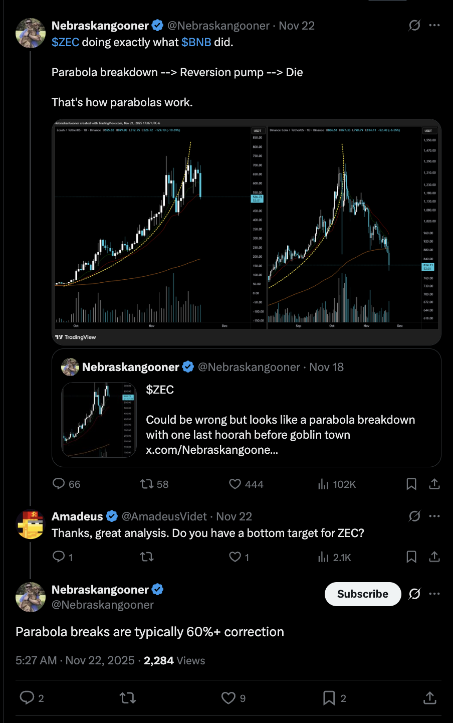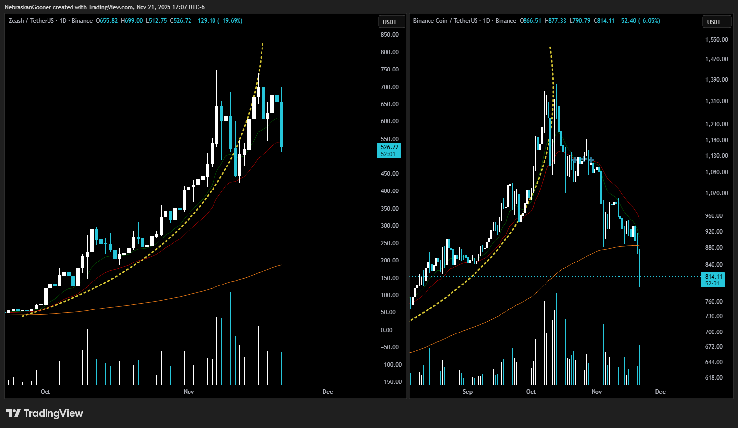 Zcash’s current structure resembles the parabolic rise and breakdown previously seen in BNB (BNB) before its steep correction, according to trader Nebraskangooner.