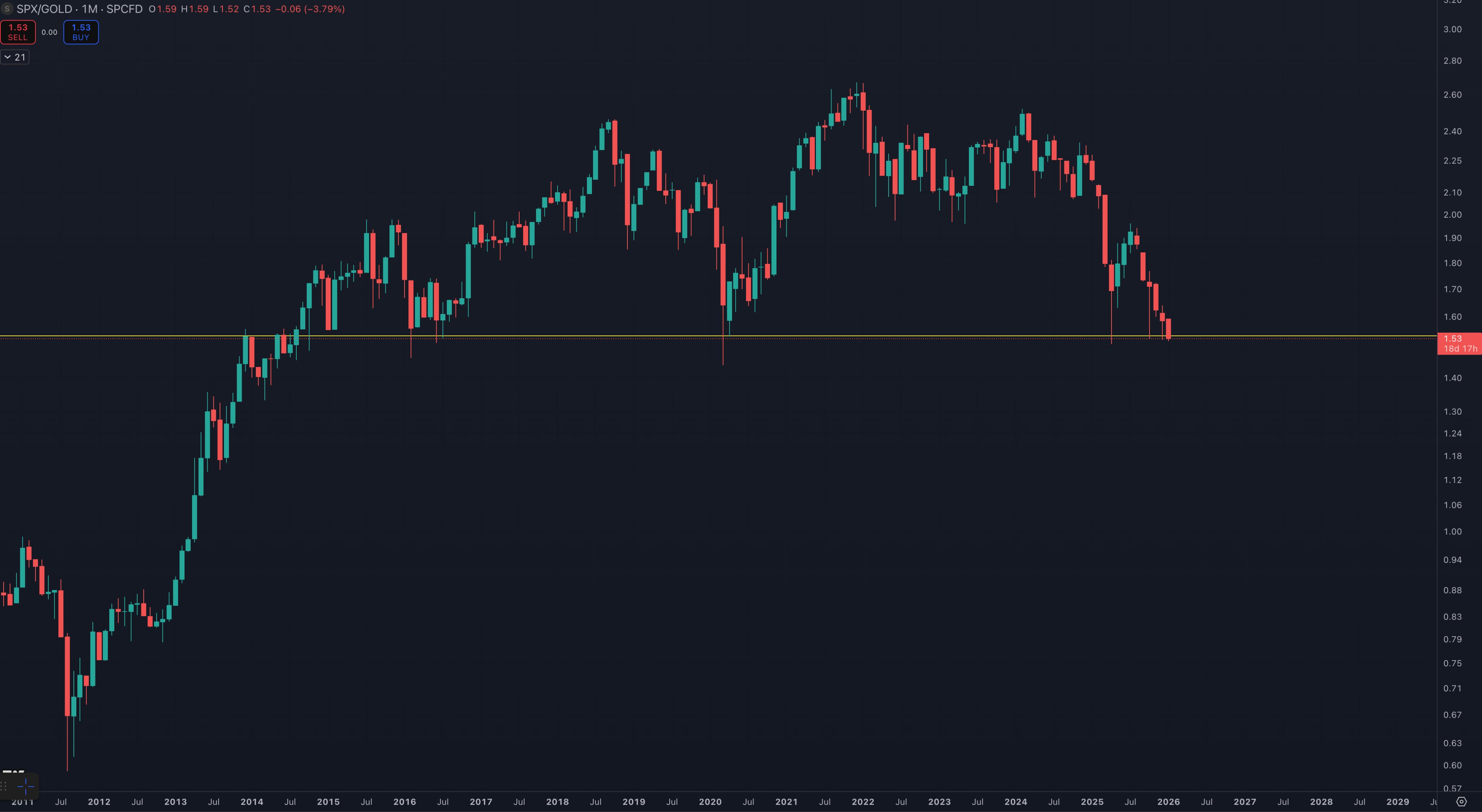 “If SPX breaks down against Gold, the environment we have found ourselves in for the last decade will completely change,” he argued, citing the monthly chart.
