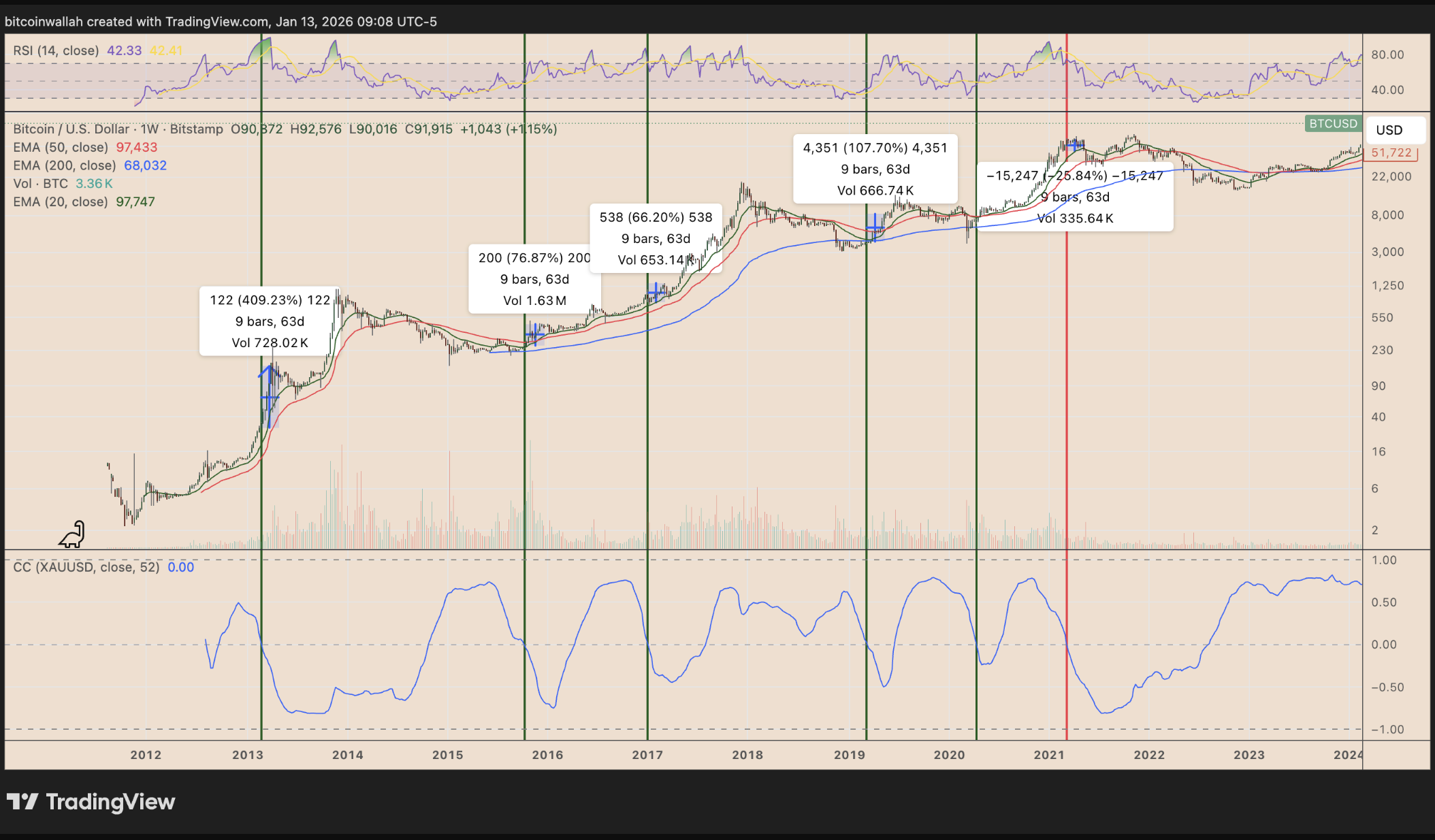Another macro signal aligned with the breakout thesis came from Bitcoin’s historical relationship with gold.