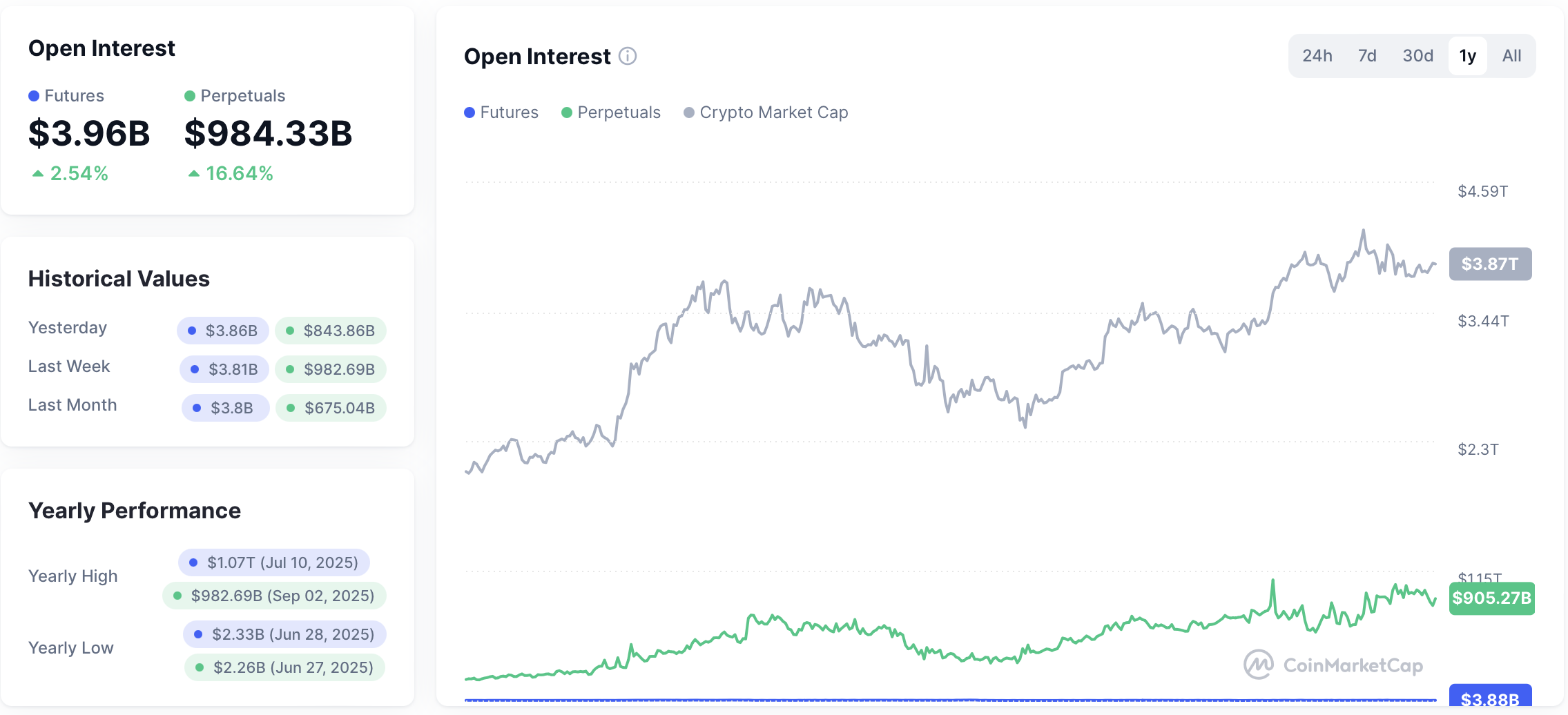 Open interest in crypto derivatives, the total value of active futures and perpetual contracts that traders hold, is currently about $3.96 billion in futures and $984 billion in perpetuals, according to CoinMarketCap data.