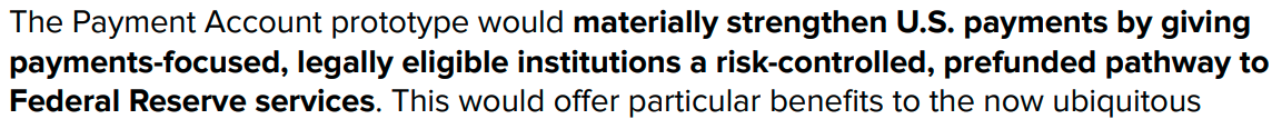 Payment accounts won’t have the same privileges as master accounts (commonly owned by big banks) — they wouldn’t earn interest or be given access to Fed credit and would have balance limits.