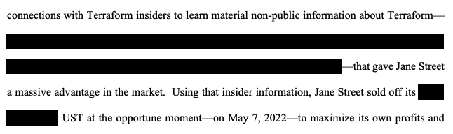 The heavily redacted complaint claimed Jane Street used connections with “Terraform insiders to learn material non-public information” about the company and used the information to sell tokens tied to the Terra blockchain that worsened its collapse.