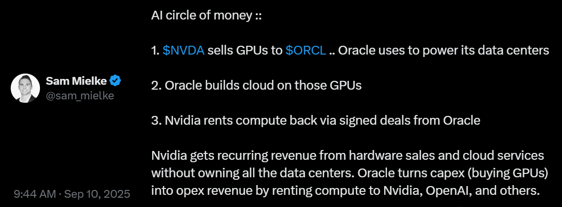 X user sam_mielke highlighted how Nvidia (NVDA) benefits from selling equipment to Oracle, generating recurring revenues even though Nvidia itself rents out the AI datacenter. The post suggested these firms may be engaging in a form of financial “cycling,” effectively converting capital expenditures into revenues.