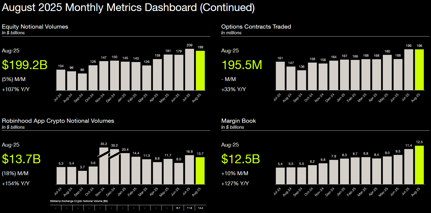 Data shows this volume had been trending down for Robinhood since November 2024, when it registered a record quarter, but ticked up in July before slumping in August.
