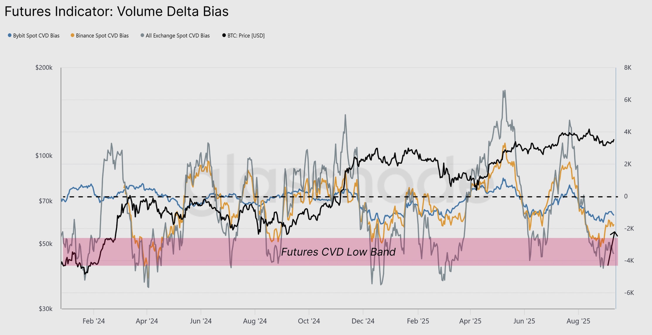 The chart below shows that Bitcoin’s volume delta bias, measuring the imbalance between buying and selling pressure, recovered during the rebound from $108,000, signaling seller exhaustion across exchanges like Binance and Bybit.