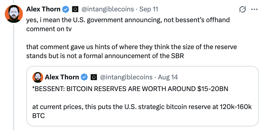 “I still think there’s a strong chance the US government will announce this year that it has formed the strategic Bitcoin reserve (SBR) and is formally holding BTC as a strategic asset,” Thorn said in an X post on Thursday.