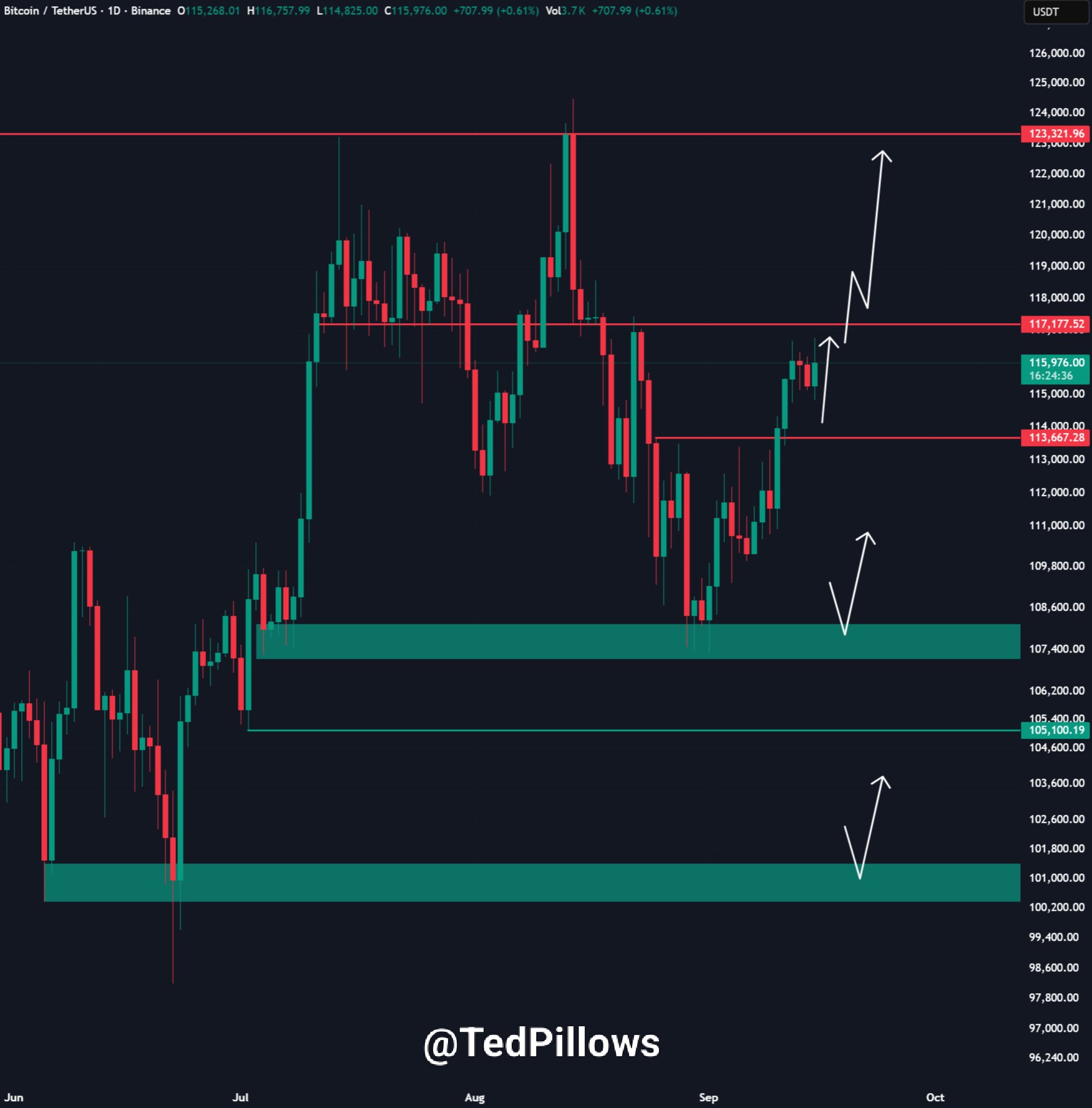 “$BTC got rejected from the $117,00-$117,200 region. This is the only key level to reclaim for Bitcoin now,” crypto investor and entrepreneur Ted Pillows told followers in his latest post on X.