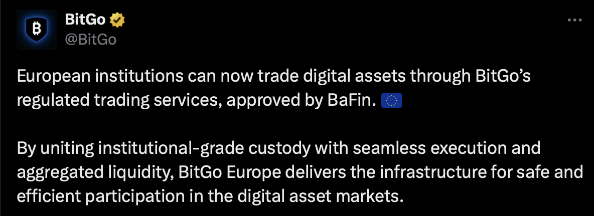 The extension builds on BitGo’s previous Markets-in-Crypto-Assets (MiCA) license, also issued by BaFIN, and adds trading to the existing custody, transfer and staking services. BitGo acquired its initial MiCA license in May 2025, which allowed it to offer certain services to traditional institutions and crypto native companies in the European Union.
