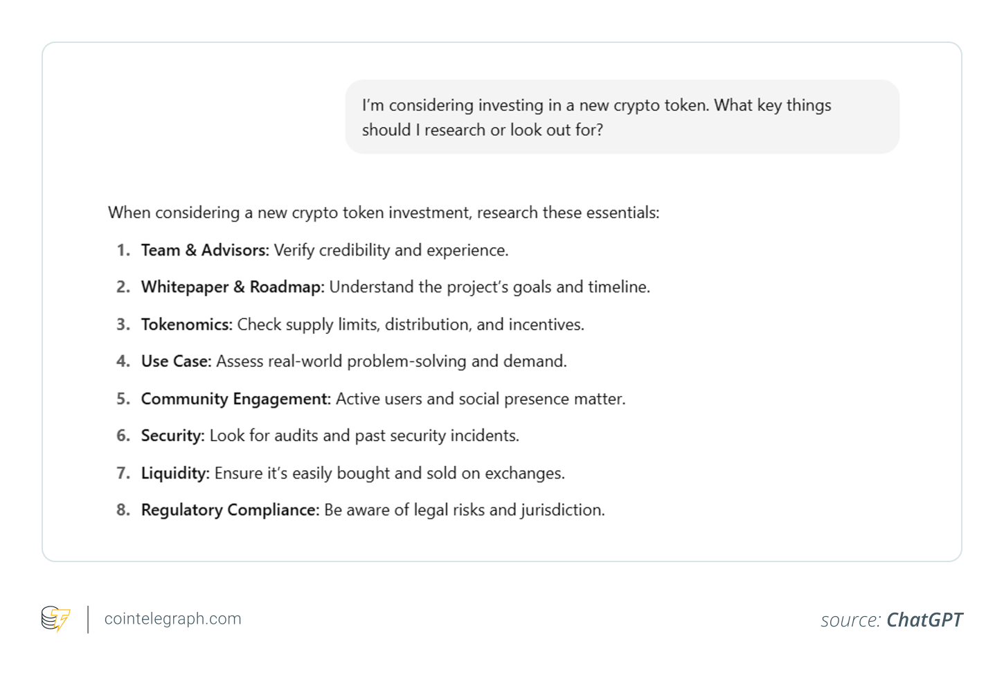 ChatGPT can give you a checklist covering fundamentals, technicals, sentiment and security, perfect for building your own research framework.