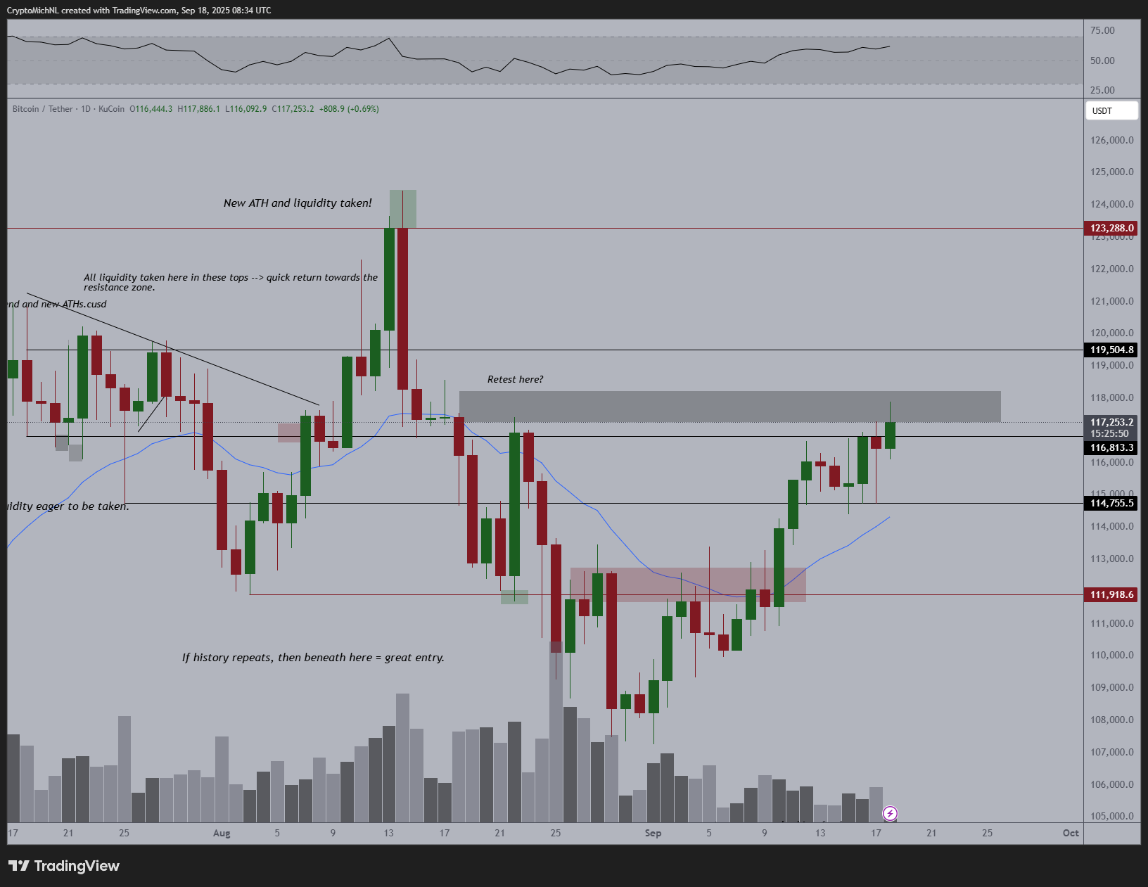 BTC/USDT one-day chart with RSI, volume data. Source: Michaël van de Poppe/X
